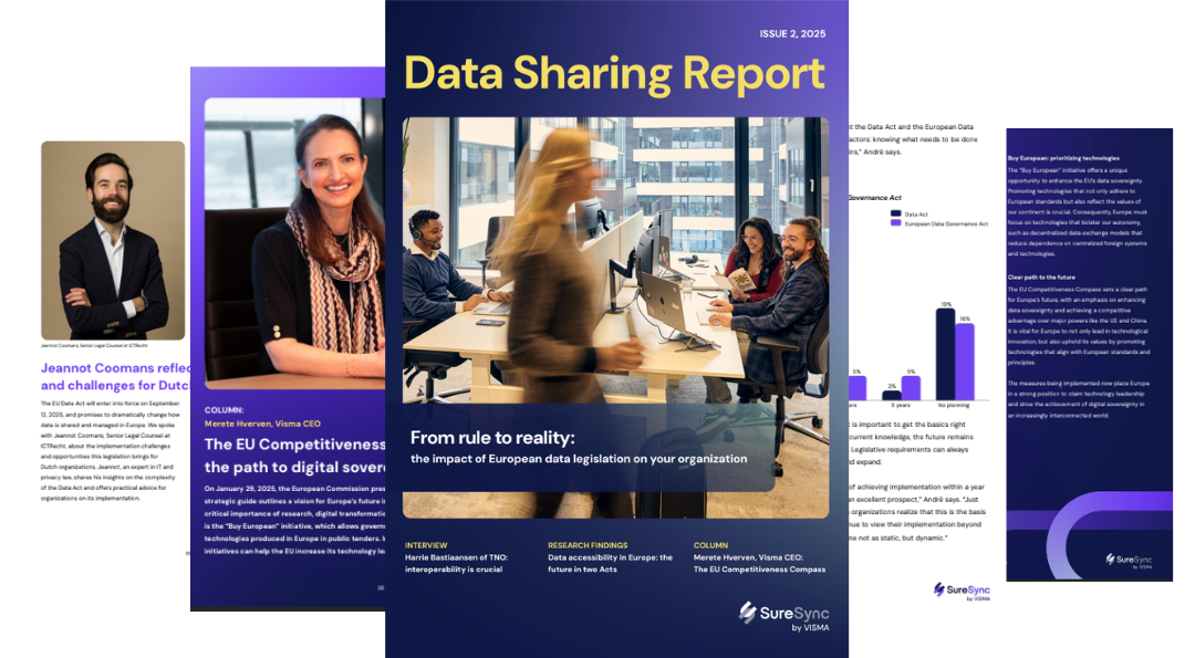 Lees de nieuwste editie van het Data Sharing Report 2025: "Van regel naar realiteit: de impact van Europese datawetgeving op jouw organisatie." Europese wetten zoals de Data Act en de European Data Governance Act veranderen de manier waarop we met data omgaan. In deze editie vertellen experts, waaronder Harrie Bastiaansen van TNO, over de mogelijkheden die deze wetgevingen bieden.