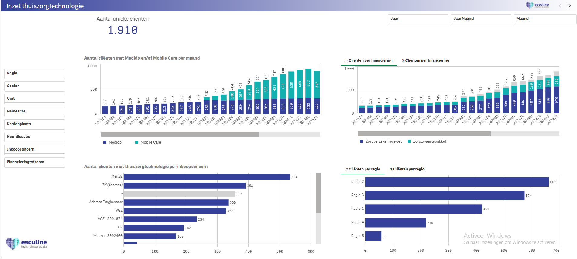 Deze weergave laat zien hoe thuiszorgtechnologie binnen de organisatie wordt ingezet, uitgesplitst naar onder andere regio, financiering en type technologie. Ook de ontwikkeling in de tijd wordt zichtbaar, waardoor trends en verschillen tussen teams direct opvallen.