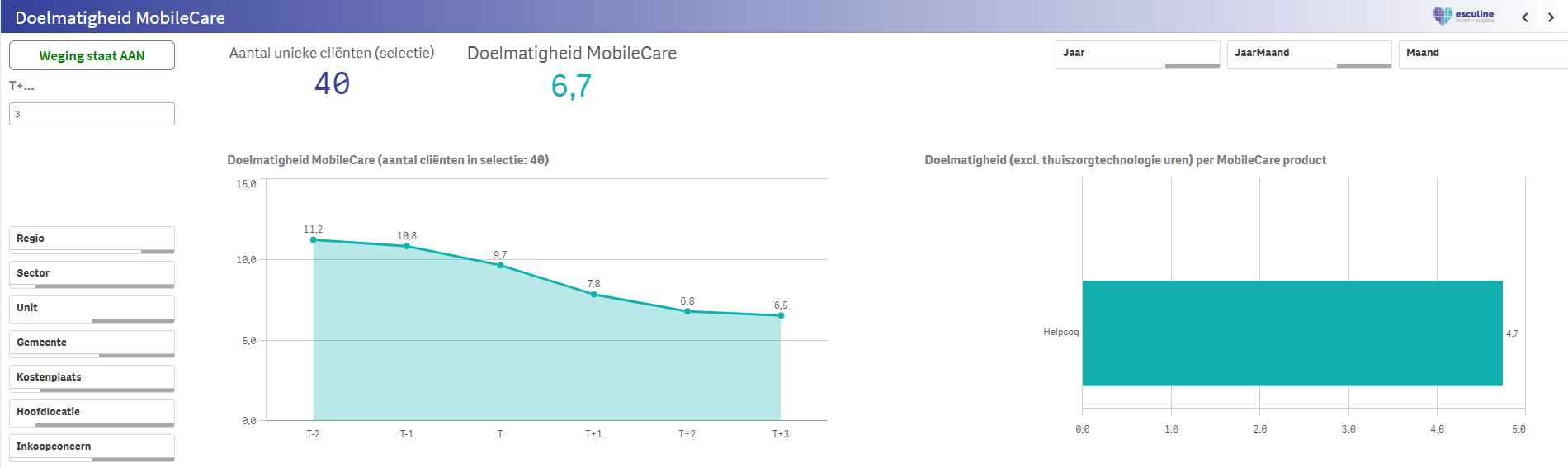 Dit dashboard toont het verloop van zorguren rondom het startmoment van technologie (T). Hierdoor ontstaat een eerste beeld van de doelmatigheid: neemt het aantal zorguren af na inzet van technologie of blijft dit gelijk